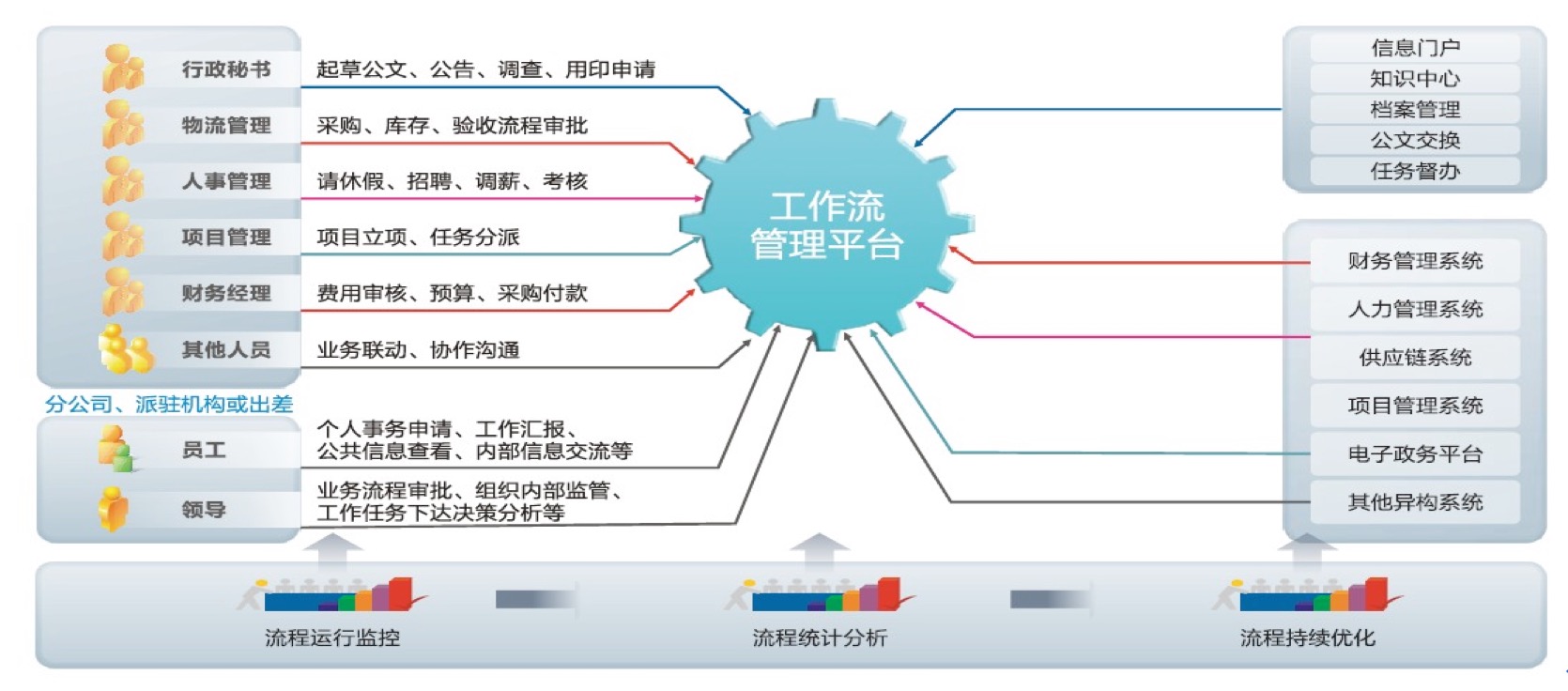 提供了强大的工作流引擎,图形化工作流设计器、多维表单设计模式,将繁琐的业务流程审批快捷化、运转透明化、监控可视化。动态地反映一个完整的业务处理过程,提升业务协作能力,提高运营效率,增强业务灵活性和透明度。
