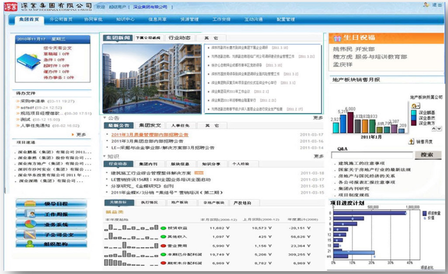 深业集团通过信息门户,结合BI(商务智能)技术,将集团内部众多业务系统的数据集中采集、处理、分析、并以图形化的方式展现,实时、真实地显示集团内部的数据,帮助高层更及时准确的进行决策分析。