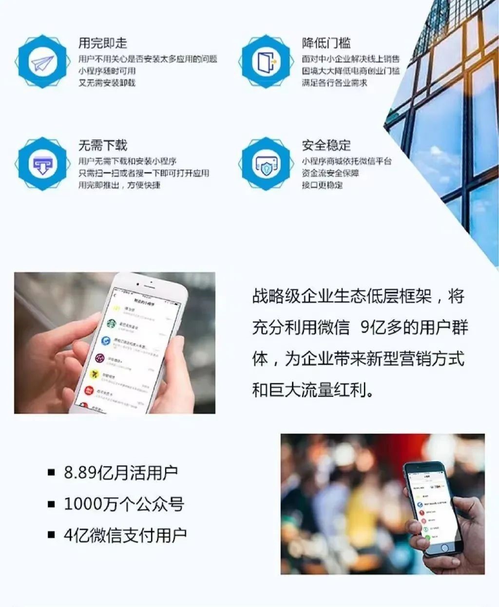 一. 小程序的优势小程序是一种不需要下载安装即可使用的应用,它实现了应用“触手可及”的梦想,用户扫一扫或者搜一下即可打击开应用。......