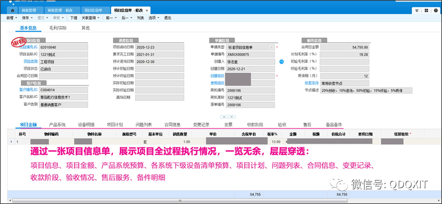 项目相关执行情况,通过一张单据,一览无余,可层层穿透,包括:项目信息、项目金额、产品系统预算、各系统下级设备清单预算、项目计划、问题列表、合同信息、变更记录、收款阶段、验收情况、售后服务、备件明细等。