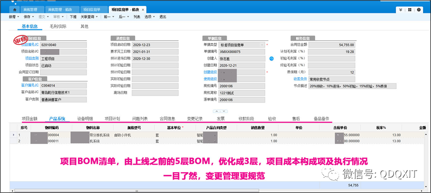 项目BOM清单,由上线之前的5-6层结构,优化成3层,项目成本构成项及执行情况一目了然,业务财务部门无需反复核。